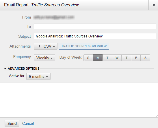| Google Analytics is something that most website owners use to track the type of traffic, a blog receives and also how much traffic which page or post on the blog receives. I am not one of those bloggers who likes to take a look at Google Analytics ten times a day. Just looking at the traffic trends once a day is more than enough. For less popular sites, I guess even once a week could be adequate. Google Analytics now allows users to send reports to an email address everyday or even once every week. Just sign into your Google Analytics account and look up the traffic stats. There you will see a link called 'Email Beta' as seen in the image below. Click on the link and you will see an option select the type of file the information is supposed to be sent to you. It could be as an excel file or even a PDF. Add in the email address of the person you want these reports to be sent out. You can select the frequency of email reports being sent out and also the time frame they are sent out. The time frame is by default set to 6 months. This is ideal for website owners to share weekly traffic stats to potential advertisers. Do drop in your comments. Related: How To Add New Users to Google Webmaster Tools Account -- This Post Automatically Send Google Analytics Reports by Email Every Day! is Published on Devils Workshop . | |||