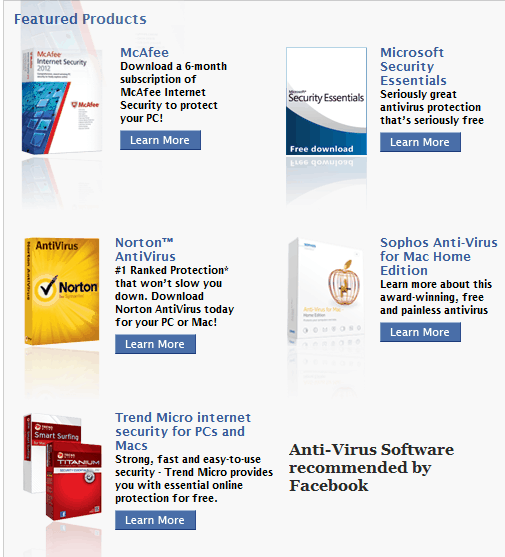 | Yesterday in a post about security, Facebook introduced what it calls a Anti-Virus Marketplace. It reccomends and links users to download from a list of anti-virus software. The five software that Facebook recommends are McAfee, Microsoft Security Essentials, Norton Anti-Virus, Sophos AV for Macs and finally Trend Micro Internet for PCs and Macs. A majority of these anti-virus software are free while a couple of them are free on a 6 months trial basis. There are some notable exceptions in this list like Kaspersky, BitDefender and AVG Anti-Virus. The pessimist in me would probably say Facebook has just found another way to sell more advertisements but fact is personal computers are usually not as well protected as they should be. So if Facebook is recommending free anti-virus to users and giving them a single page to access it, I guess it is beneficial. Will Facebook start selling software?Facebook earns a lot of money by showing advertisements and also through online gaming. But this landing page for anti-virus is curiously named Marketplace, which makes be suspect that they might get into selling software in the future. What are your views on Facebook's recommended list of anti-virus? Do drop in your comments. Related posts: