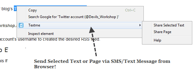 | Sometimes when I am searching for a particular address online, I like saving it as a text message on my mobile phone. This is quite useful to refer back to it, while searching for that particular place in a cab or foot. Textme is one such web service which allows users to send selected text or even links via SMS from the browser itself. Features of onTextme