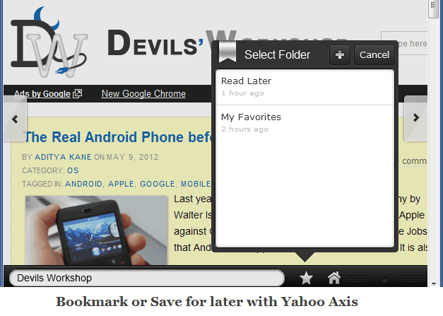 Yahoo might be a company in decline, but it still is visited by millions everyday. So this app might be quite a interesting development for users. The idea might be novel but I do think it is a case of too little, too late for Yahoo as a internet giant. Here is the video demo of Yahoo Axis What are your views on Yahoo's Axis? Do drop in your comments. Link: Yahoo Axis -- This Post Yahoo launches 'Search Browser' Axis which is actually a browser add-on! is Published on Devils Workshop . | |||